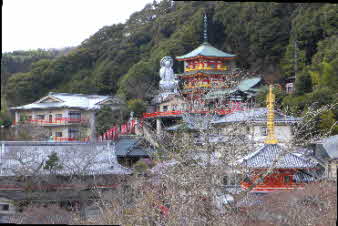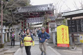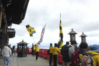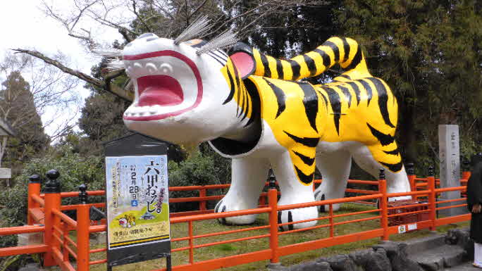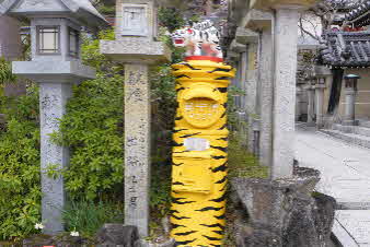 | 石段をどんどん下っていく、朝護孫子寺多宝塔を過ぎると、朝護孫子寺の本堂だ。ここまで下ってくる間中、野球の応援練習をしているのかなと思っていた。春の選抜はこの辺りではないし。 朝護孫子寺の舞台に着くと、すぐわかった。といってもタイガースファンがなにをこんなに騒いでいるのか分からなかった。 お堂の横にパンフレットが貼ってあった。「みんなで歌おう六甲おろし」「熱烈祈願」「絶対勝つぞ!阪神タイガース!!」「寅のお寺で阪神ファン大集合」・・・それは、しかも今日だ! 信貴山に響き合っていた、六甲おろしは、今ここで行なわれていたのだ。大虎の前で記念写真を撮りたかったが。しかし、お参りしている間に行事は終わったようだ。 |