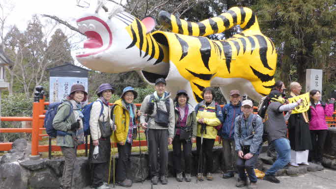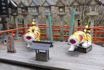 | 六甲おろしを歌いに来たファンが上に上がってくるのと入れ違いに下った。丁度、大虎に着いた頃には、ほぼ空いていてみんなで大虎の前で記念写真を撮った。 さらに下ると、奉納された虎が、ピラミッドのように積み上げて並んでいた。すごい光景だ。 |